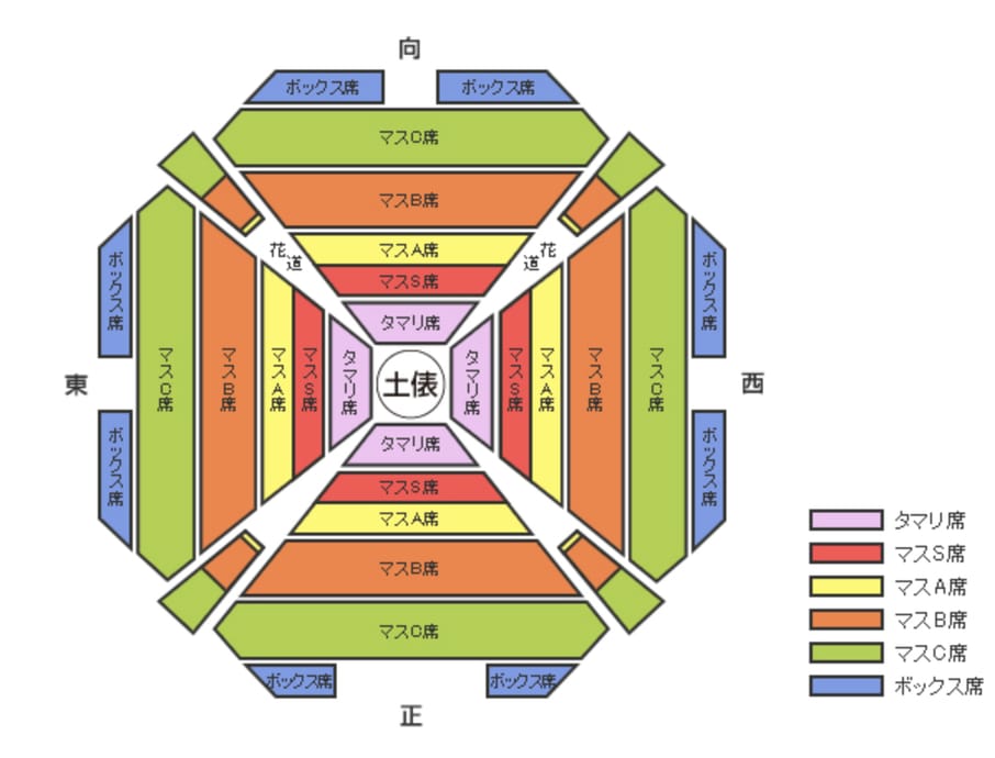 Then, take a look at the seating chart, and pricing. There are 4 areas to sit in - the front, back, east and west. All seats are good, but the best are in the front. This is the same view that the TV cameras have, which means you have an unobstructed view of the action. If you’re in the back, you’ll have the referee in your way for each match. West and East you’ll see mostly the back…er rear…uh, the front usually sells out first, so make sure to order early if possible. You don’t get to choose your specific seating orientation, but a bit of research on the sumo subreddit showed that they give away seats in the order of front, west, east, back.
