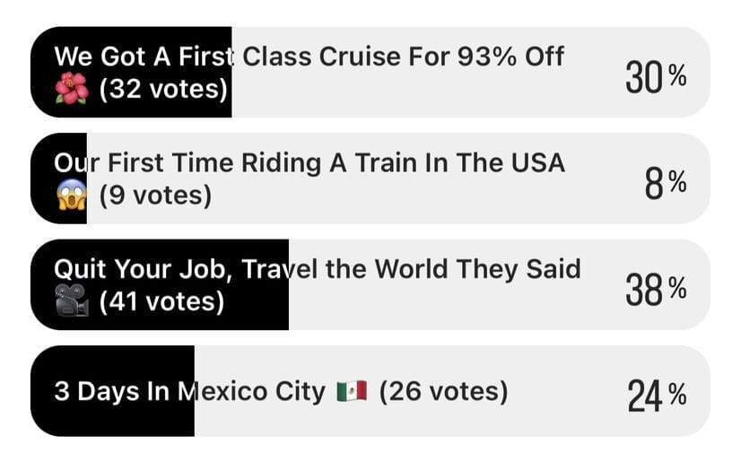 Our next video(s) are going to be about our Cruise experience, especially getting it at such a bonkers discount, and then we’re on to the thing that we’ve wanted to make for well over 9 months now, but have also been avoiding because it’s a huge undertaking - our documentary that we think we’re gonna call “Quit Your Job, Travel The World, Start A YouTube Channel”.