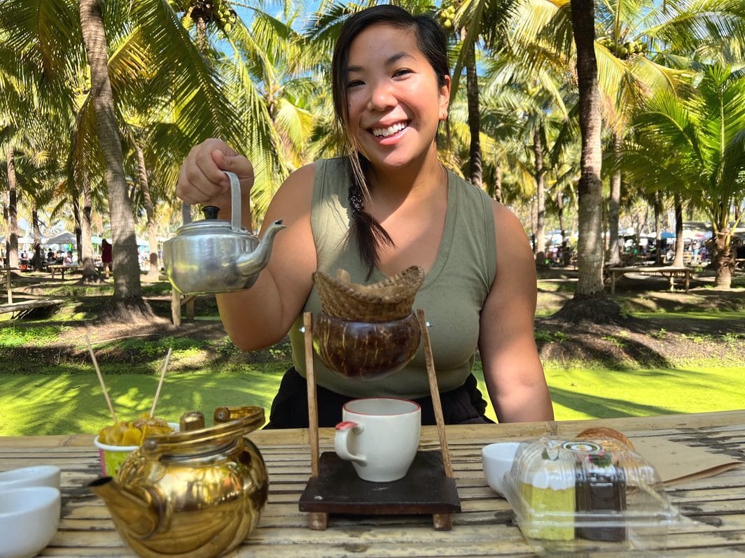 Plus, then you’ll have more room for fun souvenirs along the way. Like this coconut pour over that Lisa *had to have* from Thailand. She’s pleased to share it somehow managed in her backpack, surviving countless flights, countries, and moves.
